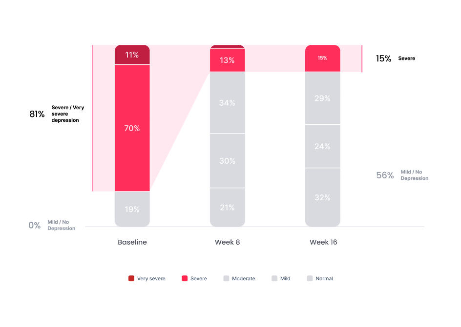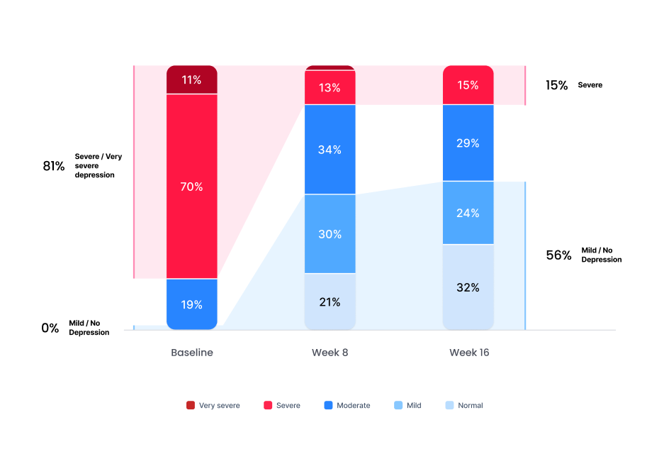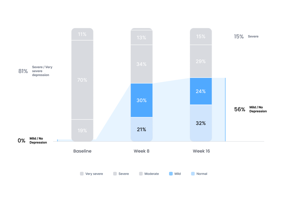 Depression severity levels: Very Severe, Severe, Moderate, Mild, No Depression. After completion of a 16-week therapy program.