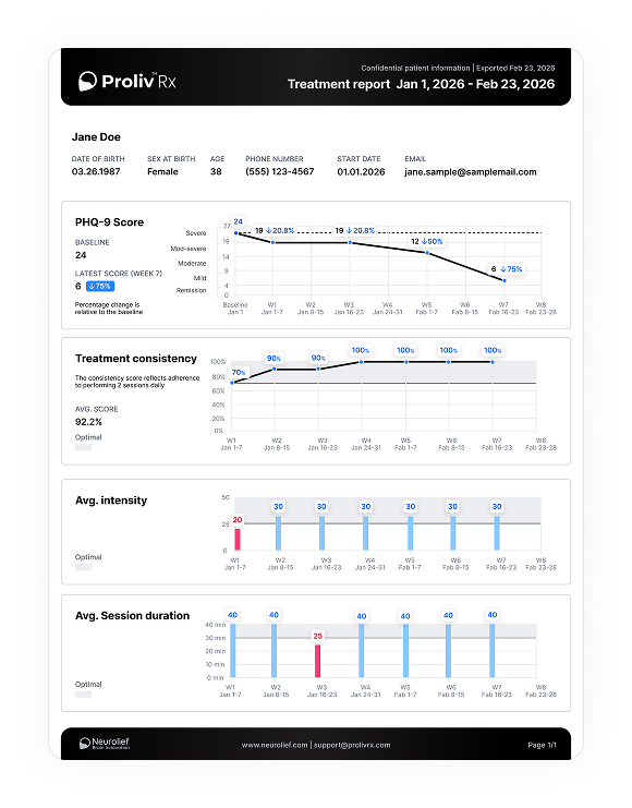 Throughout the 8-week program, patients can generate a detailed progress report from the Proliv™Rx app. The report summarizes key treatment metrics and provides physician with a clear snapshot of adherence to the therapy and progress